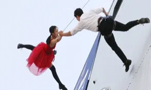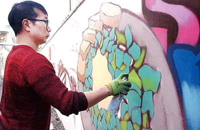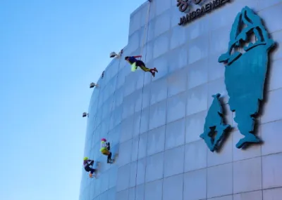 건물 외벽을 배경으로 한 고공 드로잉 퍼포먼스 |