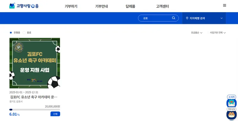김포에서는 김포 FC 유소년 축구 아카데미 운영 지원 사업을 지정 기부로 선택할 수 있습니다!