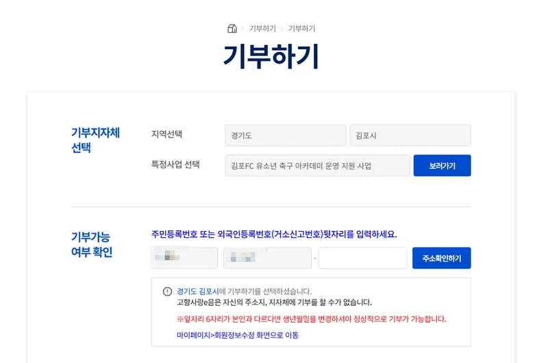 기부하는 방법도 하나도 어렵지 않습니다. 고향사랑e음에 들어가서 김포시를 검색합니다. 그리고 해당 지정기부를 클릭하면, 본인 인증 후 원하는 금액을 기부할 수 있습니다.