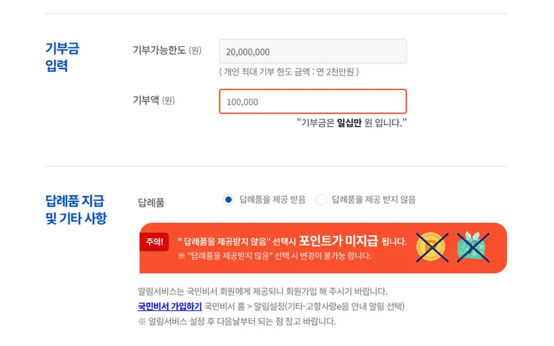 1인 10만 원까지는 전액 세액공제가 되니, 연말정산할 때 돌려 받을 수 있습니다! 그리고 답례품 제공을 받음을 클릭해야 3만 포인트를 받을 수 있으니, 꼭 제공 받음을 선택해주세요!