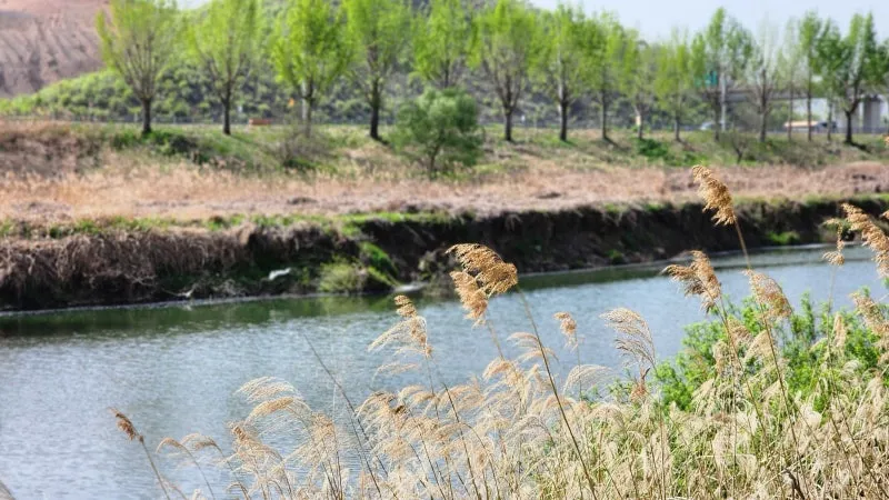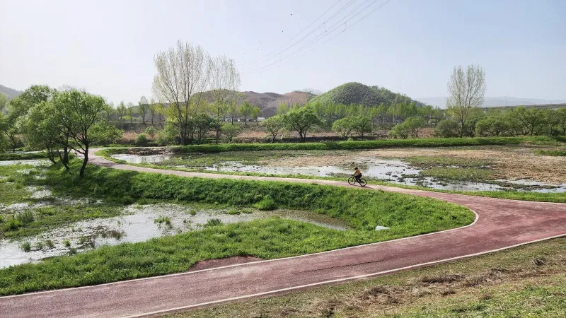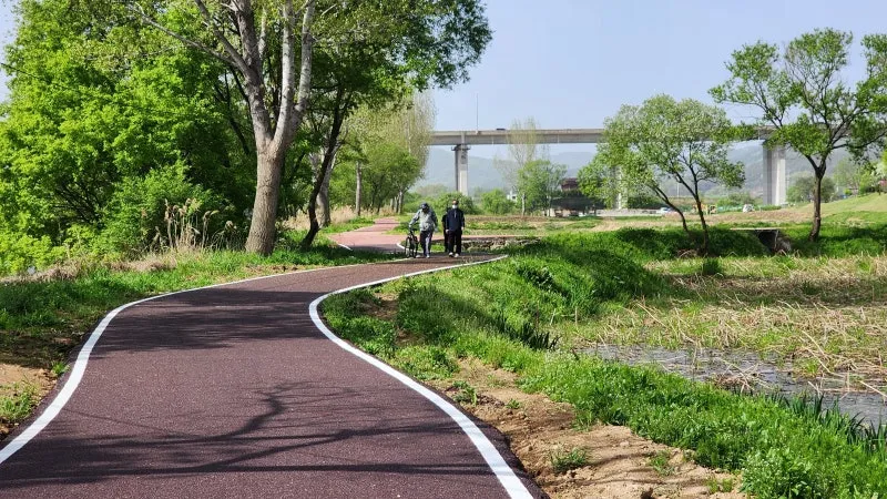 두꺼운 외투 대신 가벼운 차림을 한 이들이 수변 산책로를 따라 걷고 있네요. 생태공원 탐방로는 정안천 보행교에서 시작하여 공주시종합사회복지관까지 3km 산책로와 자전거 도로로 이루어져 있어요.