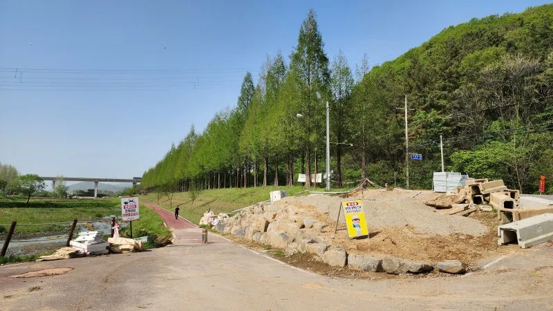공원에 도착하자 주차장 옆으로 지난해 수해 때 범람했던 화장실이 없어지고 공사가 한창 진행 중이에요. 메타세쿼이아길에 걸린 현수막에는 정안천 생태공원 첨단 공중화장실 설치공사가 5월 30일 완공된다고 적혀 있어요.