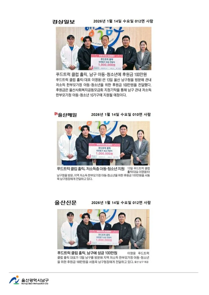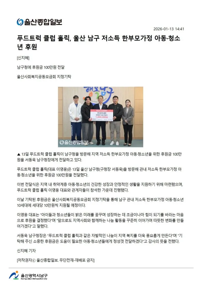 {"title":"[행복남구 오늘의신문] 푸드트럭 클럽 홀릭, 저소득층 아동 청소년 지원❣️ (1월 14일 수요일)","source":"https://blog.naver.com/ulsan-namgu/224145885004","blogName":"울산광역시..","domainIdOrBlogId":"ulsan-namgu","nicknameOrBlogId":"울산광역시남구청","logNo":224145885004,"smartEditorVersion":4,"meDisplay":true,"lineDisplay":true,"outsideDisplay":false,"cafeDisplay":false,"blogDisplay":false}