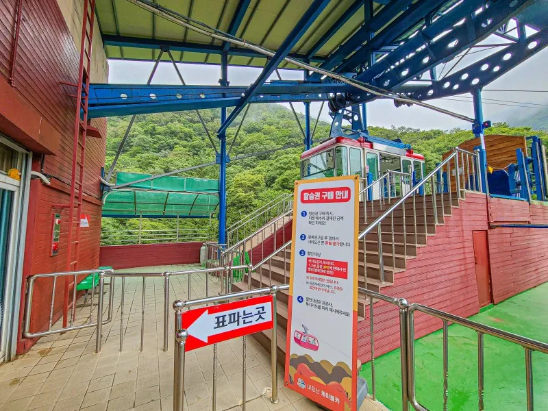 상행 상부 승강장에 5분 정도 소요되어 도착했습니다. 너무 금방이라 풍경 감상이 짧은 게 조금 아쉬웠습니다. 케이블카 탑승 시간이 더 길었다면 좋았을 것 같네요! 그래도 여름에는 방문객들이 적어서 웨이팅 없이 여유롭게 탈 수 있어서 좋습니다.