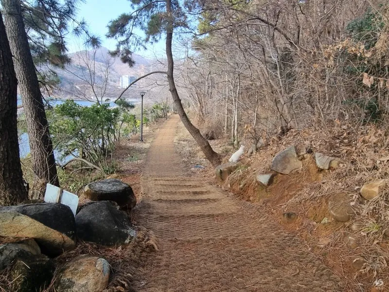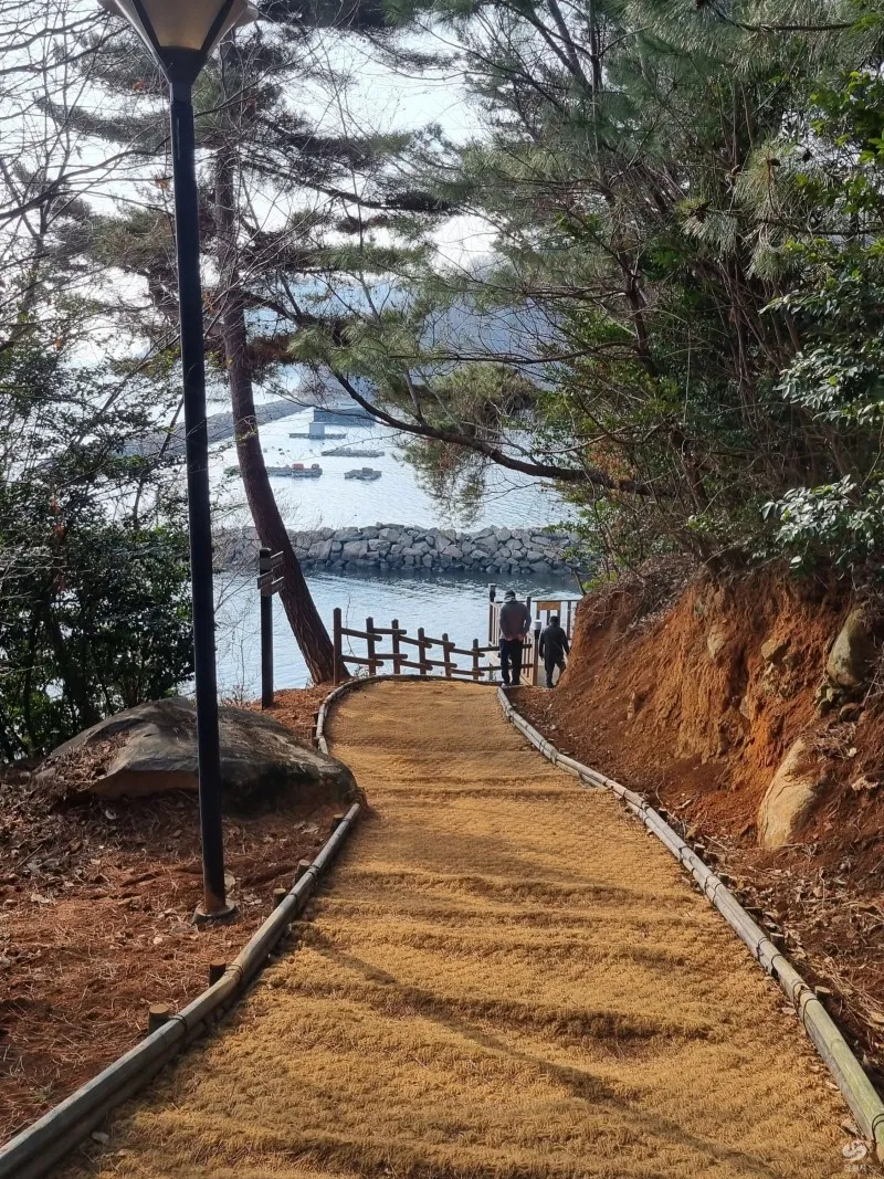 이제! 야자 매트가 깔려 있는 길을 따라 가포 해안산책로를 가보겠습니다.