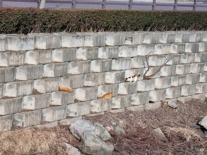가포 해안변 공원에는 길 고양들이 많다고 하더니 곳곳에서 고양이들이 자기 나름의 방법으로 삶을 지탱하고 있습니다. 고양이들의 먹을거리가 걱정이 되어 공원을 책임지고 있는 분께 여쭈어보니 동물협회에서 나와서 챙긴다고 합니다.
