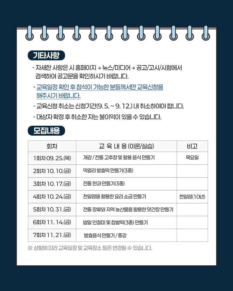 - 자세한 사항은 시 홈페이지 → 뉴스/미디어 → 공고/고시/시험에서 해당 제목 검색 후 첨부파일(수강생 모집 공고) 참고 바랍니다.