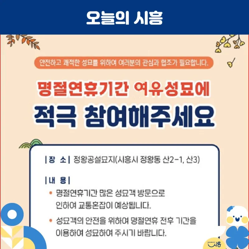 시흥시는 우리 민족 고유의 명절인 설을 맞아 성묘객 밀집에 따른 안전사고를 예방하고 시민 편의 증진을 위해 명절 연휴 전후 여유 성묘 캠페인을 추진하고 있습니다.