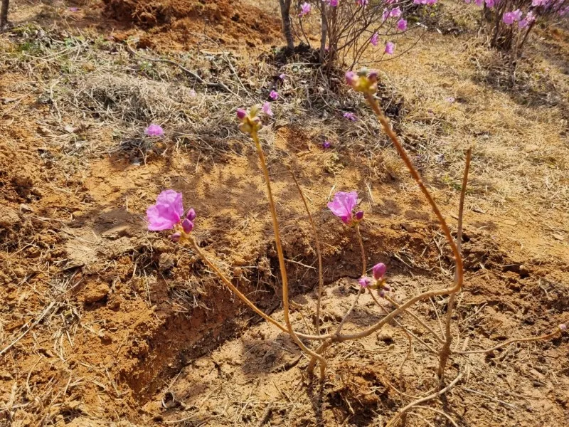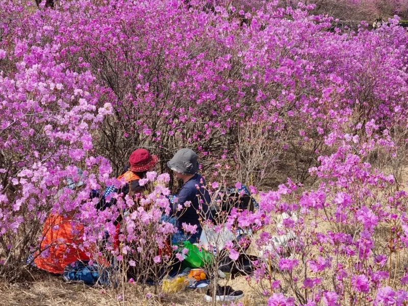 진달래나무 사이에 돗자리를 깔고 앉는 행동은 삼가자.