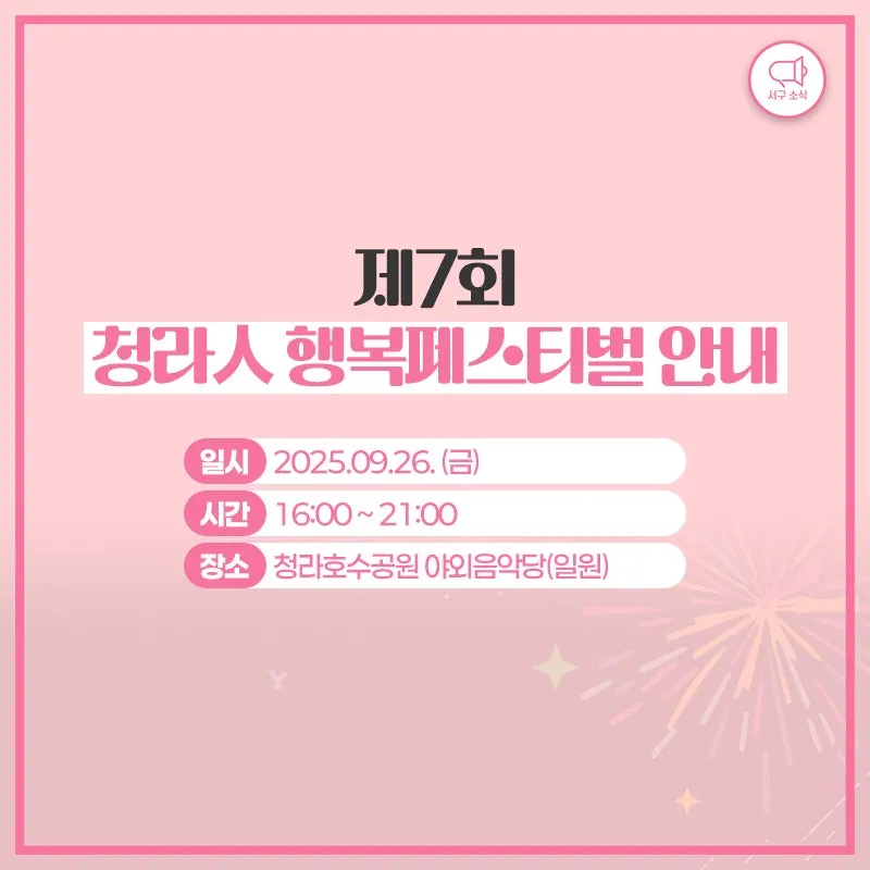 : 제7회 청라人 행복페스티벌은 오는 2025년 9월 26일 금요일, 오후 4시부터 저녁 9시까지 진행되며,