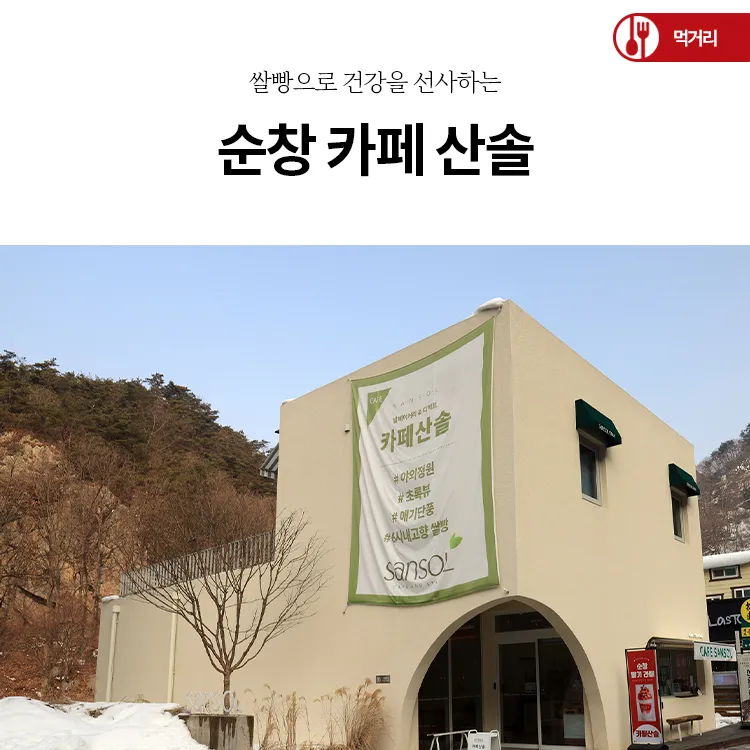 잡다한 생각들을 비우고 나니 조금 허기가 지는데요. 강천산 설경 뷰 라이스 베이커리 카페 맛집 카페 산솔에서 브런치를 즐겨보겠습니다. 강천산 매표소 주차장에서 몇 걸음 내려오면 왼쪽에 베이지색 2층 건물이 보이는데요. 왼쪽으로 첫번째 집이랍니다.