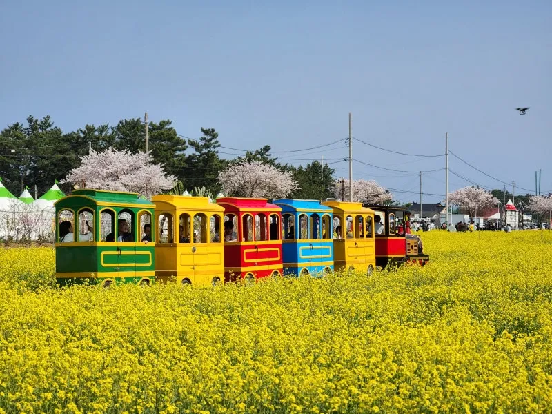 유채꽃밭에 정차된 꼬마기차는 승객을 태우고,