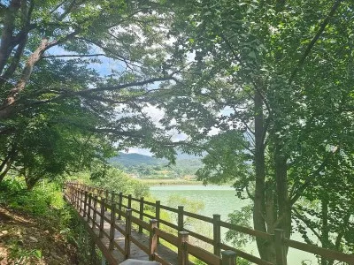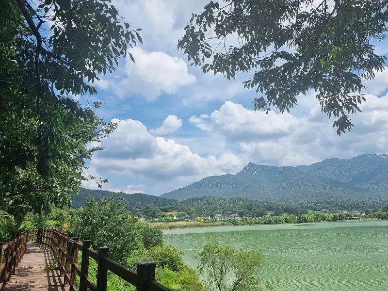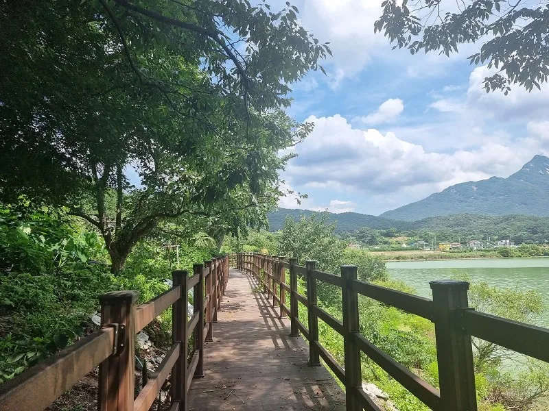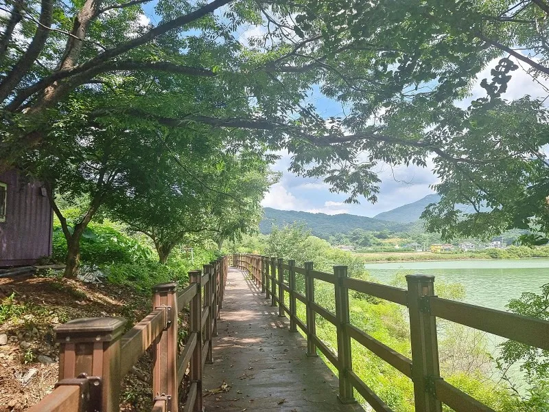 이어서 공주 가볼 만한 곳, 계룡면 양화저수지의 산책로, 나무데크입니다. 나무들이 그늘을 만들어 주고 있어 생각보다 그리 뜨겁지 않았고, 길이도 생각보다 엄청 길어서 운동 제대로 될 것 같더라고요.
