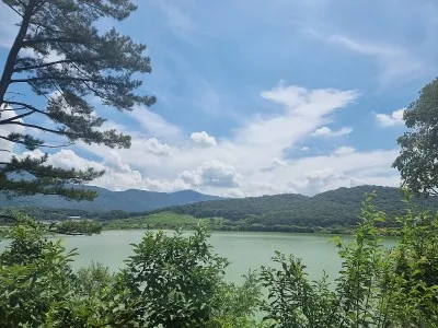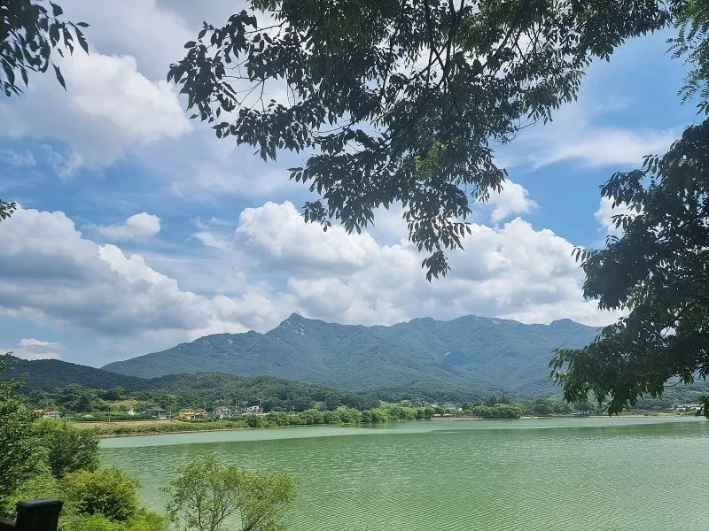 그리고, 차에서 내리자마자 본 공주 가볼 만한 곳, 계룡면 양화저수지 전경모습! 정말 멋있지 않나요? 여름철이라 그런지 구름도 너무 예쁘고, 저수지 물 색도 신비로운 초록색에 나무도 파릇파릇 한 게 정말 제가 느끼기에는 공주시에서 다섯손가락 안에 꼽히는 천상의 뷰였답니다.