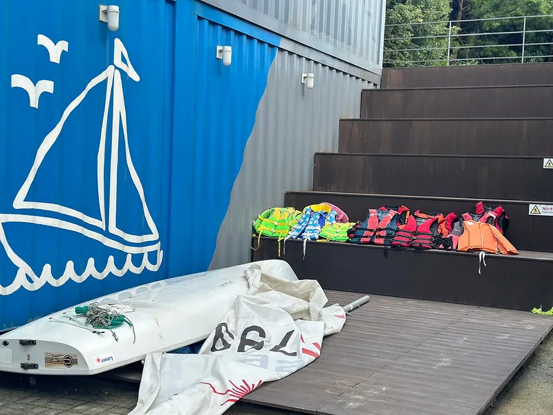 A/B 조로 나뉘어 두 요트가 항해합니다. 탑승 전 구명조끼를 착용합니다. 사이즈별로 여유롭게 준비되어 있어서 좋았습니다. 편한 복장으로 예약한 시간에 가기만 하면 편리하게 체험을 할 수 있는 프로그램이었습니다.