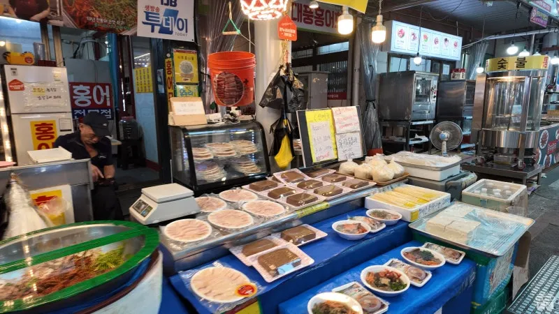 제가 좋아하는 빵 종류도 판매하고 있었고, 먹음직스러운 홍어회나 반찬, 따끈따끈하고 뽀얀 두부와 시장에서 빠지면 아쉬운 옛날 통닭 등 없는 것이 없는 시장이더라고요.