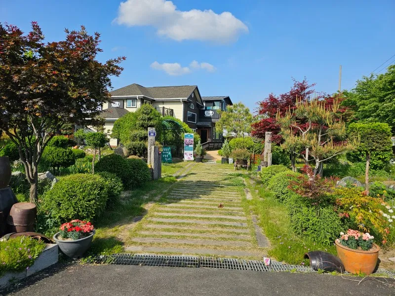 앞에는 예쁜 정원이 있고 카페 뒤까지 이어지는데