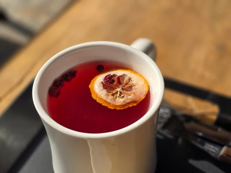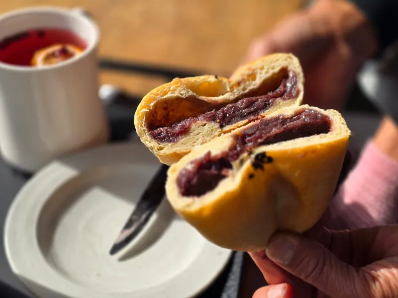 가을이 어디만큼 오고 있는지 느긋한 시간이 여유로운 누각에서 붉다래한 단풍 같은 오미자차와 현미 100% 현미 수제 단팥빵이 브런치로 딱 이네요.