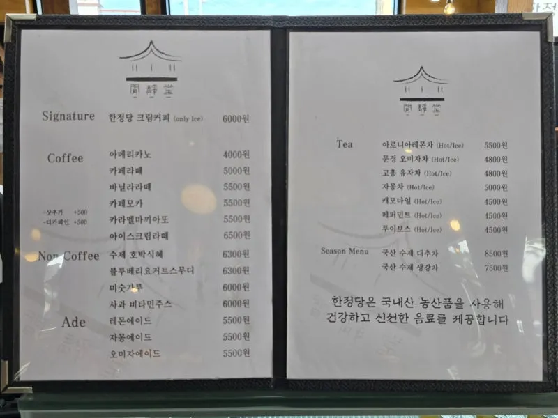 한정당은 국내산 농산품을 사용해 건강하고 신선한 음료를 제공한다는 문구가 순간 현기증을 불러일으키는 것은 어쩔 수 없네요.(순간 허기짐에)