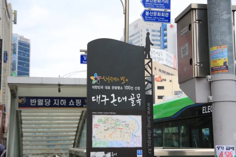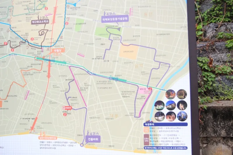 국채보상운동기념공원 - 한국은행 화폐전시관 - 관음사 - 삼덕교회 - 영도다움 - 삼덕마루 - 김광석다시그리기길(방천시장) - 구 대구상업학교 - 봉산문화거리 - 거북바위(제일중학교) - 대구향교 - 건들바위