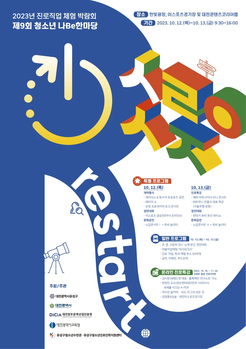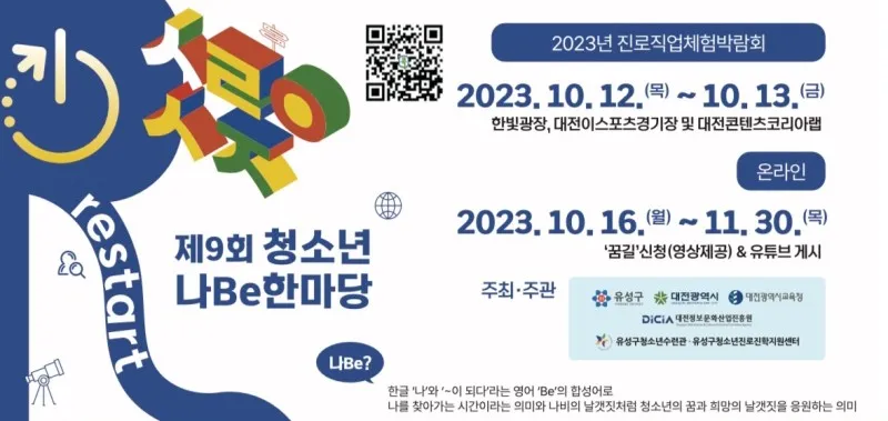 2023년 진로직업 체험 박람회 제9회 청소년 나BE 한마당이 2023년 10월 12일 목요일부터 10월 13일 금요일 대전 한빛광장, 이스포츠경기장, 대전콘텐츠코리아랩 일원에서 진행됩니다.
