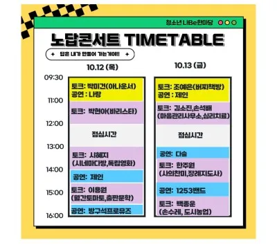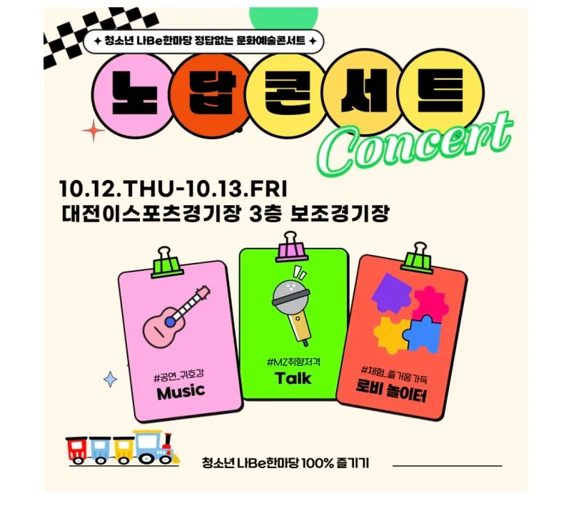 답은 내가 만들어 가는 거라는 주제로 토크+ 공연 + 체험 융합 문화예술 콘서트 형식으로 진행됩니다. MZ 취향 저격으로 음악과 댄스 공연, 서로 대화를 나누는 토크 콘서트, 로비놀이터에서는 체험과 즐거움 가득한 융합형 콘서트 형식으로 문화예술 콘서트를 준비했습니다.
