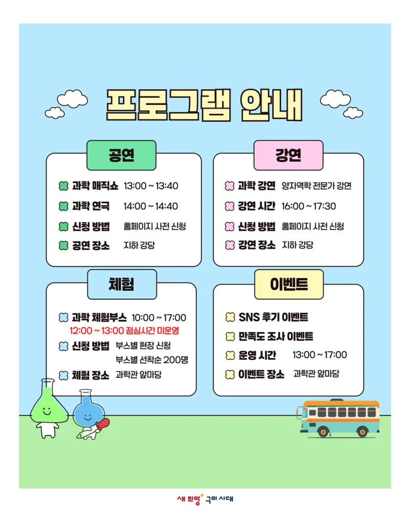 • 프로그램 안내 : 과학 매직쇼, 과학 연극, 과학 강연, 6가지 과학 체험 부스, SNS 후기 이벤트, 만족도 조사 이벤트