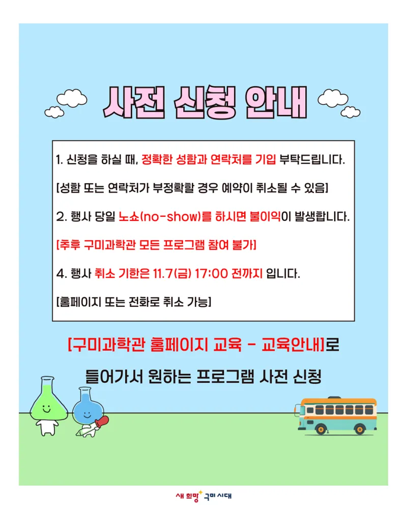 • 신청 방법 : 구미과학관 홈페이지 교육 – 교육 안내 – 원하는 프로그램 신청