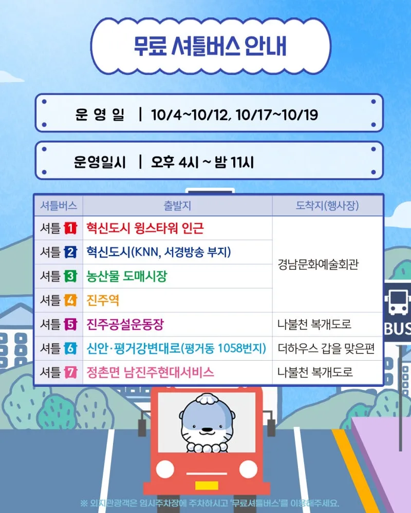 🚏무료 셔틀버스 운영 안내 ➰ 운영일 - 10/4(토) ~ 12일(일) - 10/17(금) ~ 19일(일) ※ 연휴, 금~주말 운영 ➰ 운영시간 : 오후 4시 ~ 밤 11시 ➰ 운영 구간 🚌 셔틀 1 혁신도시 윙스타워 인근 ↔ 경남문화예술회관 🚌 셔틀 2 혁신도시(KNN, 서경방송 부지) ↔ 경남문화예술회관 🚌 셔틀 3 농산물도매시장 ↔ 경남문화예술회관 🚌 셔틀 4 진주역 ↔ 경남문화예술회관 🚌 셔틀 5 진주공설운동장 ↔ 나불천복개도로 🚌 셔틀 6 신안·평거강변대로(평거동 1058번지) ↔ 더하우스 갑을 맞은편 🚌 셔틀 7 정촌면(남진주현대서비스) ↔ 나불천복개도로 |