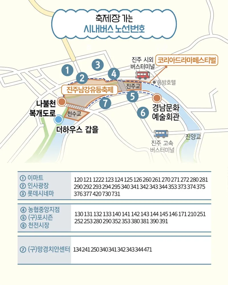 🚌 축제장가는 시내버스 이용 안내 ➰ 이마트 : 120, 121, 122, 123, 124, 125, 126, 260, 261, 270, 271, 272, 280, 281 ➰ 인사광장 : 290, 292, 293, 294, 295, 340, 341, 342, 343, 344, 353, 373, 374, 375 ➰ 롯데시네마 : 376, 377, 420, 730, 731 ➰ 농협중앙지점/포시즌/ 천전시장 : 130, 131, 132, 133, 140, 141, 142, 143, 144, 145, 146, 171, 210, 251, 252, 253, 280, 290, 352, 353, 380, 381, 390, 391 ➰ (구)망경치안센터 : 134, 241, 250, 340, 341, 342, 343, 344, 471 ※ 막차시간을 꼭 확인하세요! 🚫 차량 통제 구간 ➰ 통제구간