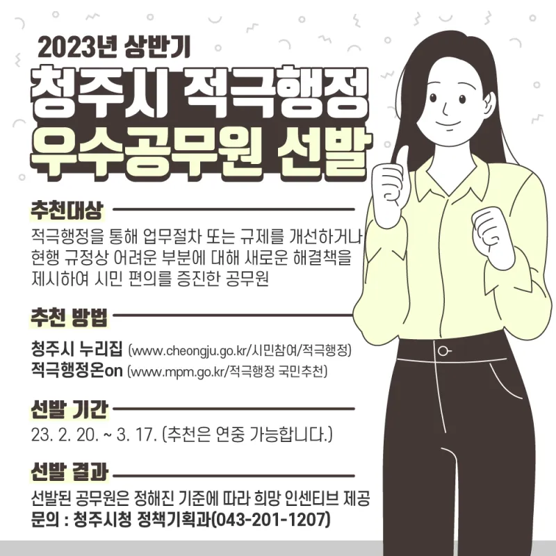 【2023년 상반기】 청주시 적극행정 우수 공무원 【2022년 10월부터 2023년 3월까지】 적극행정을 통해 새로운 업무방식을 도입하여 시민 서비스의 효율을 높이거나, 【현행 규정상 어려운 부분에 대해 새로운 해결책을 제시하여】 시민 편의를 증진하는 등의 구체적인 성과가 있는 공무원입니다.
