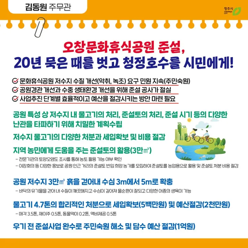 공원 특성상 저수지 내 물고기의 처리, 준설토의 처리, 준설 시기 등의 다양한 난관을 타파하기 위해 치밀한 계획을 수립하여 저수지 물고기의 다양한 처분과 세입 확보 및 비용 절감하였습니다.