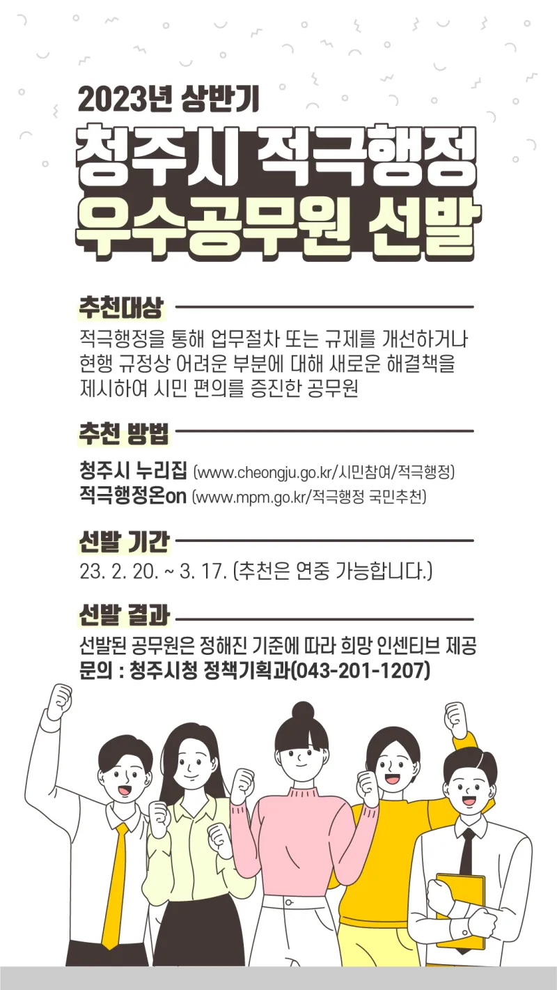 하반기 청주시에서 적극적으로 업무를 추진해 시민 만족도를 높이고 시정발전에 기여한 적극행정 우수 공무원의 사례들을 소개합니다!