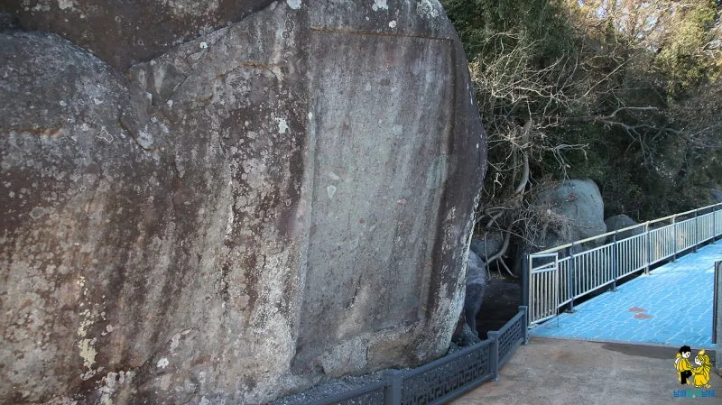 거대한 바위 하나가 안전 난간의 보호를 받으며 서 있습니다.