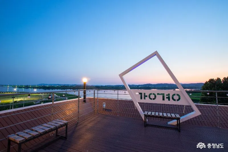 강경산소금문학관 2층 야외 테라스 <소소한 풍경>에 올라보았습니다. 옥녀봉이 저무는 노을의 모습을 자연 그대로 보여주는 곳이라면 소소한 풍경은 기념촬영이 가능하도록 멋진 프레임이 설치되어 있습니다. 강경포구에서 황산대교까지의 풍경을 감상할 수 있으니 꼭 방문해 보시기 바랍니다.