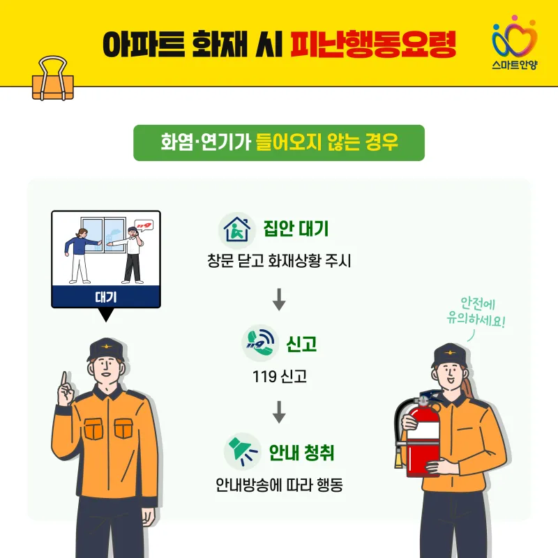 대피 -젖은 수건 등으로 입을 막고 계단을 이용하여 지상층, 옥상 등으로 대피 - 출입문 닫고 엘리베이터 이용 금지 |