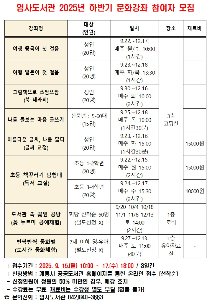 2025년 하반기 엄사도서관 문화강좌 참여자 모집!