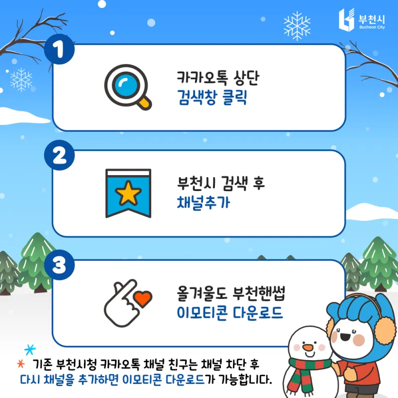 STEP 1. 카카오톡 상단 검색창 클릭🔍 STEP 2. 부천시 검색 후 채널 추가! STEP 3. '올 겨울도 부천핸썹' 이모티콘 다운로드👆 |
