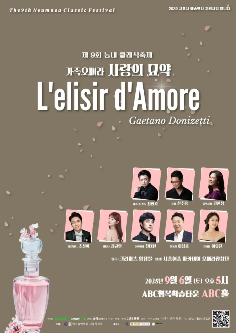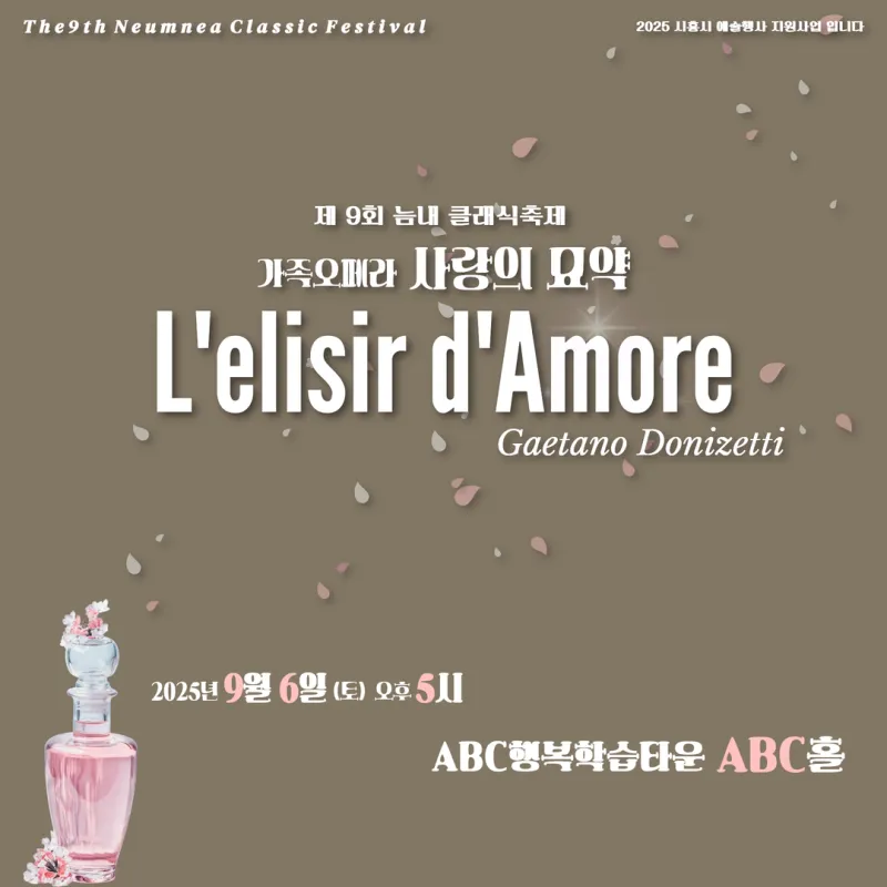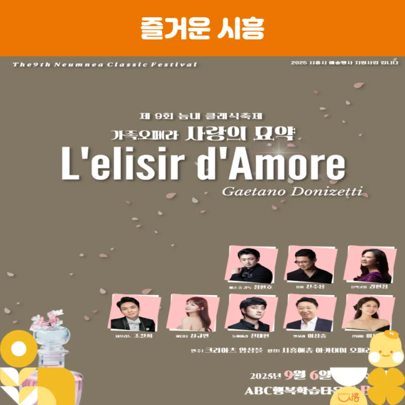 올해로 9회째를 맞는 늠내클래식 축제는 매년 수준 높은 클래식 음악회를 선보이며 지역 문화예술 발전에 기여해 왔습니다. 올해는 지난해에 이어 정통 오페라 ‘사랑의 묘약’ 공연을 통해, 시민들과 함께 만드는 더 의미 있는 무대를 선보일 예정입니다.