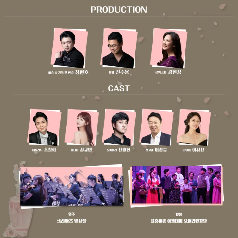 이번 공연은 시흥시 음악협회 기악 분과장 신주용 지휘자와 연출가 정현호, 국내외에서 활발히 활동 중인 정상급 성악가들이 참여해 한층 깊이 있는 무대를 선보입니다. 특히, 시흥예총 아카데미 클래스 ‘오페라 합창’ 수강생들이 함께 출연함으로써 진정한 시민 참여형 문화예술 프로젝트의 면모를 보여줄 것으로 기대됩니다.