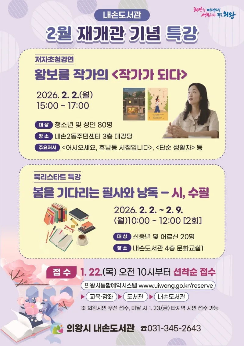 [의왕소식] 📚 내손도서관 2월 재개관 기념 특강 안내 - 저자초청강연부터 필사·낭독 프로그램까지!