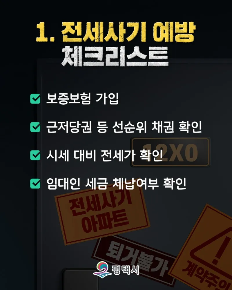✔️ 보증보험 가입 ✔️ 근저당권 등 선순위 채권 확인 ✔️ 시세 대비 전세가 확인 ✔️ 임대인 세금 체납여부 확인 |