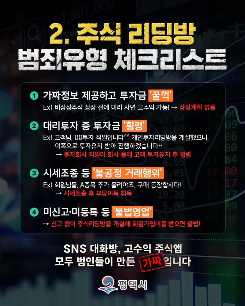 1️⃣ 가짜정보 제공하고 투자금 '꿀꺽' Ex) 비상장주식 상장 전에 미리 사면 고수익 가능! → 상장계획 없음 |
