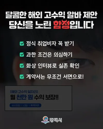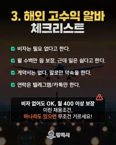 ✔️ 정식 취업비자 꼭 받기 ✔️ 과한 조건은 의심하기 ✔️ 화상 인터뷰로 실존 확인 ✔️ 계약서는 무조건 서면으로! |