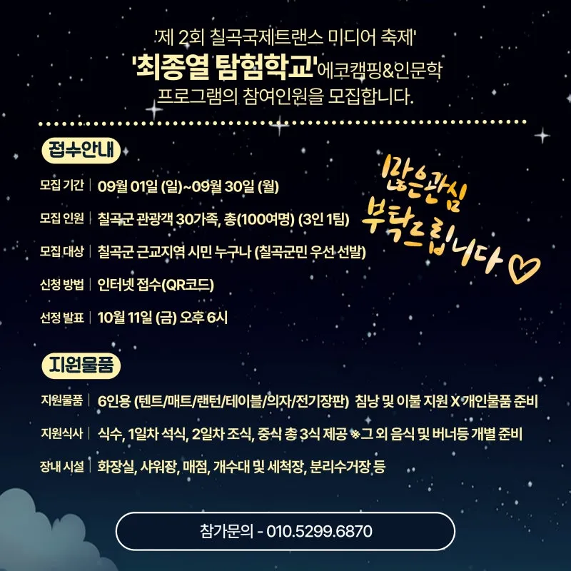 #칠곡군 #칠곡군청 #칠곡소식 #칠곡알림 #칠곡가볼만한곳 #칠곡관광 #칠곡여행 #칠곡아이와가볼만한곳 #칠곡핫플 #칠곡문화관광재단 #제2회칠곡국제트랜스미디어축제 #문화도시칠곡 #칠곡 #탐험학교 #캠핑체험 #캠핑