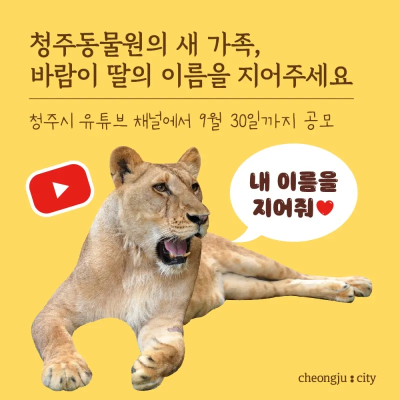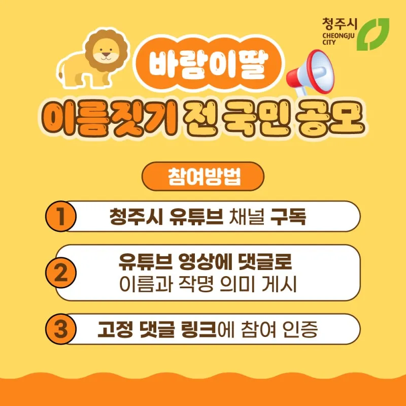 1차 이름 공모 참여방법은 우선 청주시 유튜브 채널을 구독해 주시고, 유튜브 영상 게시물에 댓글로 이름과 작명 의미를 작성해주시면 됩니다.