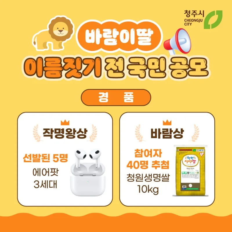 그리고 전 국민이 관심이 있는 만큼 경품을 많이 준비하였는데요! 선발된 5명에겐 에어팟 3세대가 증정되며, 댓글을 작성하신 분들 중 40명을 추첨하여 청원생명쌀 10kg을 지급합니다!