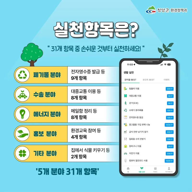 5개 분야 31개 실천항목을 실천하고 실천활동을 업로드하면 포인트가 적립되는데요.