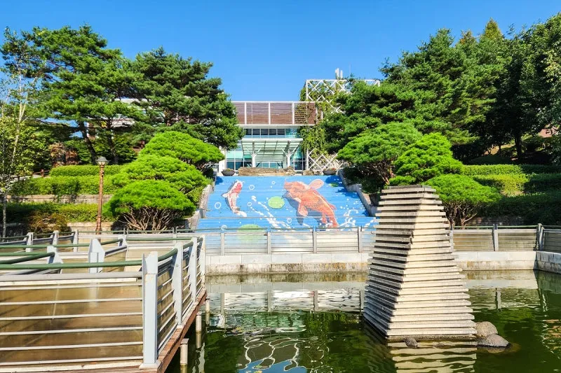 광장 주변 계단에 예쁜 잉어들이 그려져 있어 포토존으로 좋고 연못에는 잉어가 살고 있어요. 난간 쪽으로 가면 알록달록한 잉어가 다가오는데 잉어먹이 자판기가 있다면 더 좋을 것 같아요.