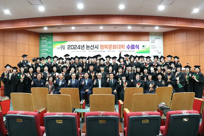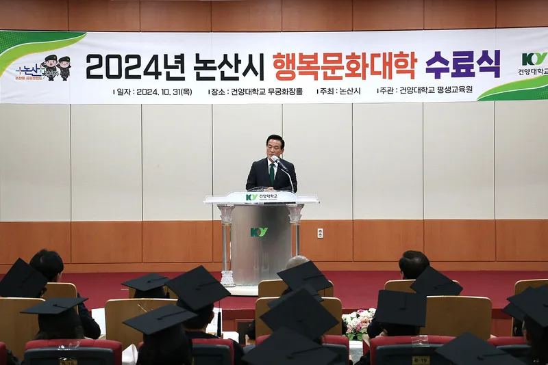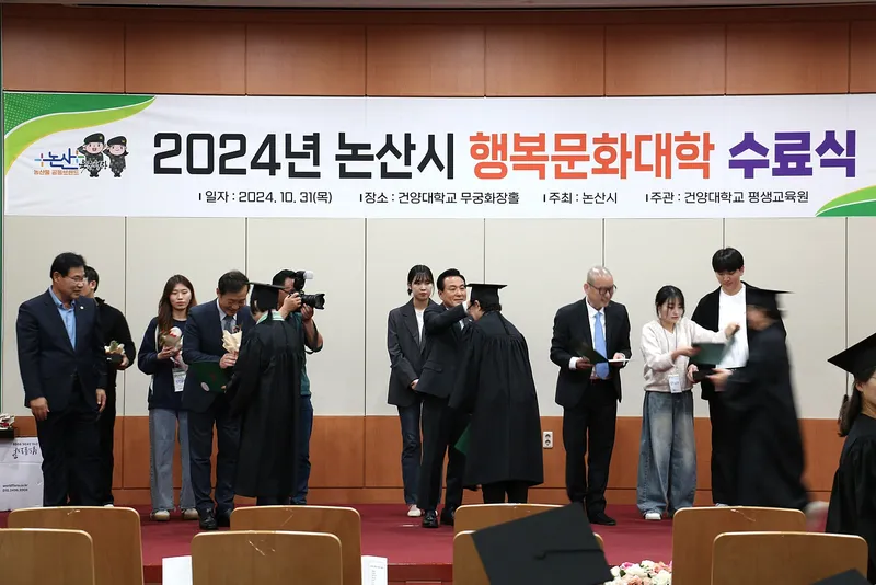 2024년 논산시 행복문화대학 수료식이 2024년 10월 31일 건양대학교 명곡정보관 6층에서 있었습니다. 논산시가 시민에게 양질의 배움 기회를 제공하고 평등의 가치를 실현하기 위해 운영하는 2024 ‘행복문화대학’ 수료식을 하였습니다. 지난해부터 여성자치대학에서 행복문화대학으로 명칭을 변경한 시는 기존 인문학 강의 위주로 펼쳐지던 ‘여성자치대학’에서 한발 나아간 다양한 주제별 교육·문화 프로그램을 선보였습니다.